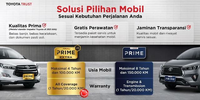 –         Prime Extra:Program warranty ini berlaku untuk mobil bekas Toyota dengan usia maksimal 4 tahun dan 100.000 km. PT Toyota-Astra Motor (TAM) melalui jaringan bengkel resmi di seluruh Indonesia, akan memberikan perbaikan atau penggantian atas komponen yang termasuk dalam skema garansi yang tidak berfungsi dengan baik atau rusak secara gratis selama 1 tahun atau 20.000 km.