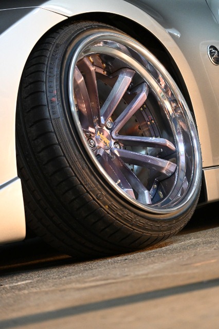 Mobil ini menggunakan velg HSR FORGED dengan kode RFG HRN MJT dengan diameter 19 inci, lebar 11 inci dengan offset minus 22 di depan dan lebar 12 inci dengan minus 13 di belakang bikin mobil semakin semok. Finishing velg tersebut diberi warna Disk Brush Grey dan dipadu Big Brake Kit HSR Braking system bikin tampil lebih sporty.